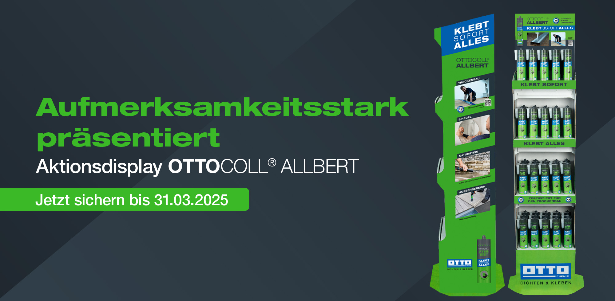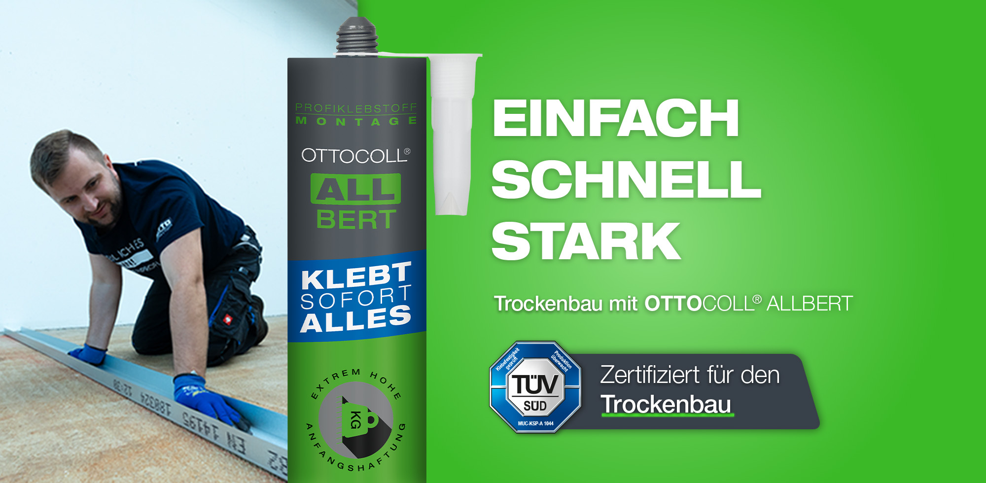 wenn Schrauben keine Option ist, ist Kleben die Lösung. Deshalb haben wir unseren OTTOCOLL® ALLBERT optimiert und mit der TÜV SÜD-Zertifizierung für den Einsatz im Trockenbau noch vielseitiger gemacht. Darüber hinaus möchten wir Sie auch bei der Präsentation auf Ihrer Verkaufsfläche unterstützen.