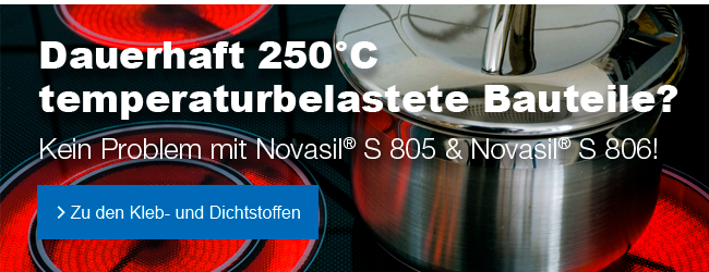Novasil® S 806 ist ein neutral, kondensationsvernetzender 2K-Hochtemperatur-Silicon-Kleb- und Dichtstoff auf Alkoxy-Basis mit einer dauerhaften Temperaturbeständigkeit bis + 250°C. Novasil® S 806 mit einem Mischungsverhältnis nach Volumen von 10:1 kann auf allen marktüblichen Misch- und Dosieranlagen verarbeitet werden und überzeugt mit folgenden Produkteigenschaften:
